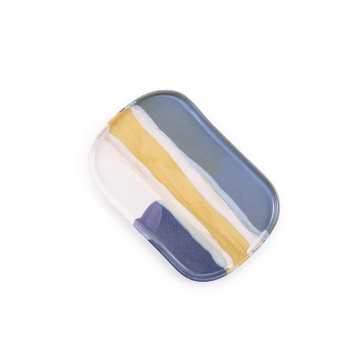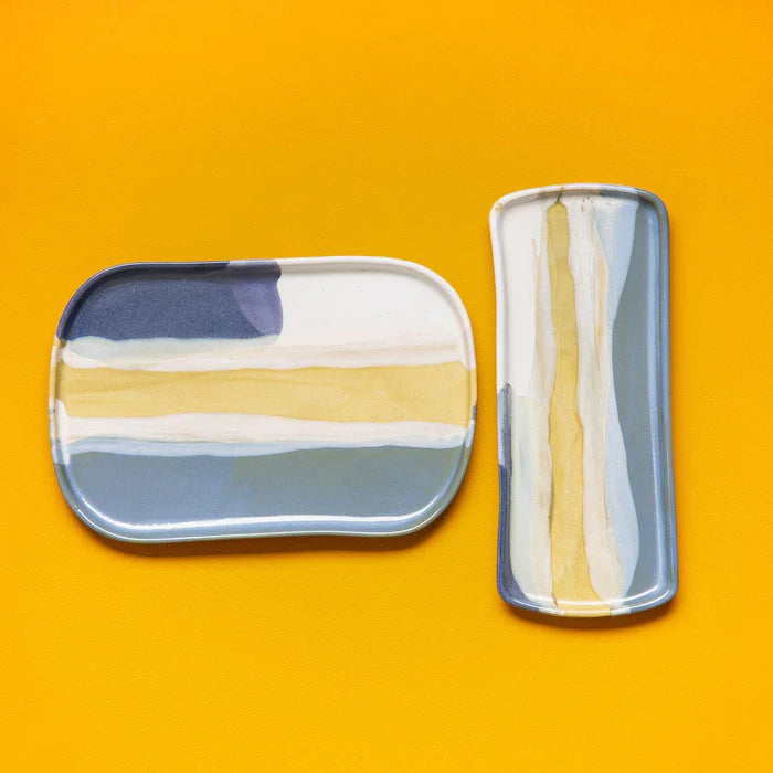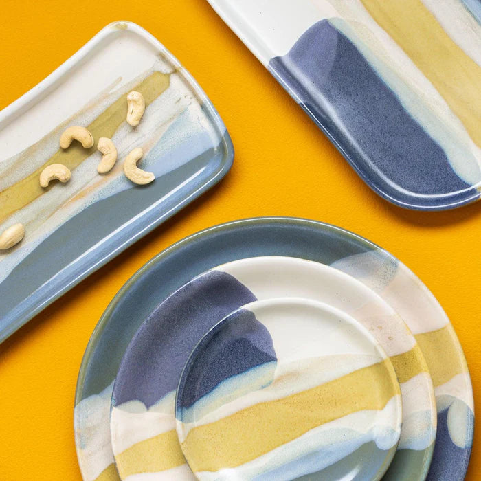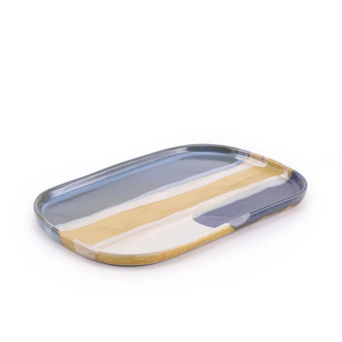 Introducing our Tofino collection's large platter, a beautiful and functional addition to your dinnerware. The platter is inspired by the natural beauty of Tofino and features a layering of multiple gorgeous reactive glazes on the plating area, accomplished by hand layering multiple glazes with precision. This gives the platter a unique and beautiful texture that evokes the ocean and sandy beaches of Tofino.